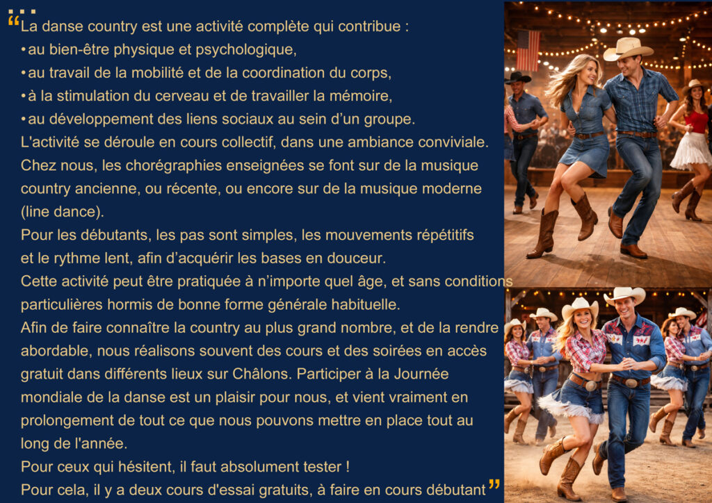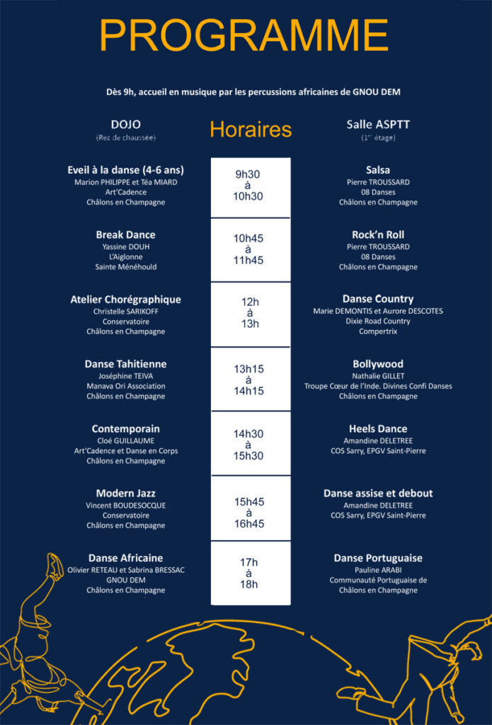 Nous organisons pour la cinquième fois La Journée Mondiale de la Danse à Châlons-en-Champagne. Elle se tiendra au Complexe Municipal René Saché (15 rue Jacques Duclos à Châlons) le dimanche 15 mars 2026 de 9h à 18h.